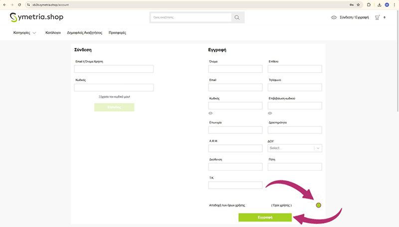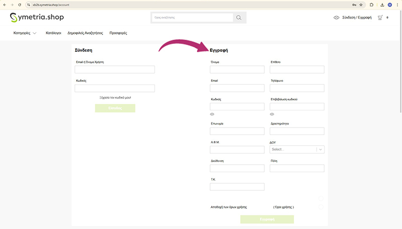 Στην Αρχική Σελίδα του νέου μας B2B πατήστε Σύνδεση/Εγγραφή πάνω δεξιά.