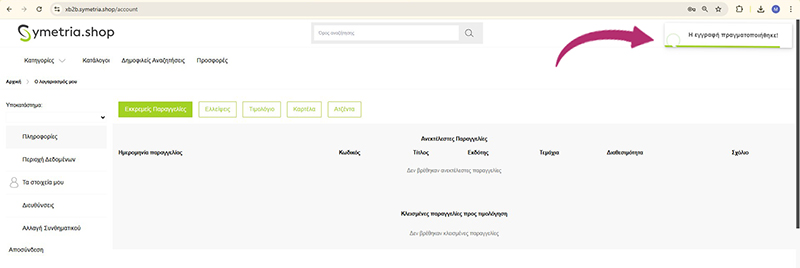Επάνω δεξιά εμφανίζεται ένα μήνυμα ότι η εγγραφή σας πραγματοποιήθηκε.