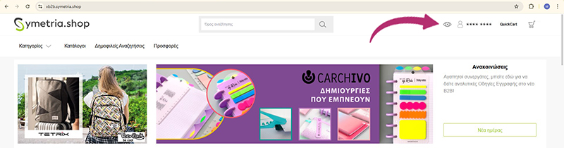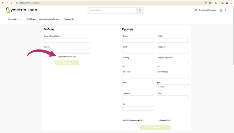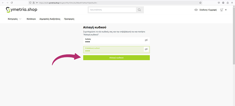 Ανοίγει στο browser σας η σελίδα https://xb2b.symetria.shop/account και εκεί δηλώνετε νέο κωδικό πρόσβασης και την επιβεβαίωση του και πατάτε Αλλαγή κωδικού.