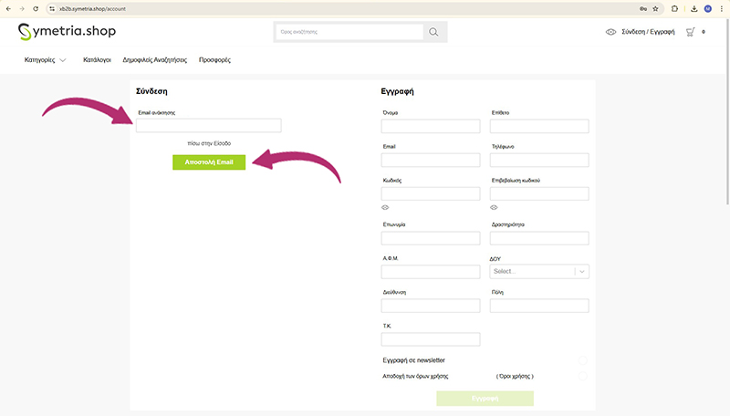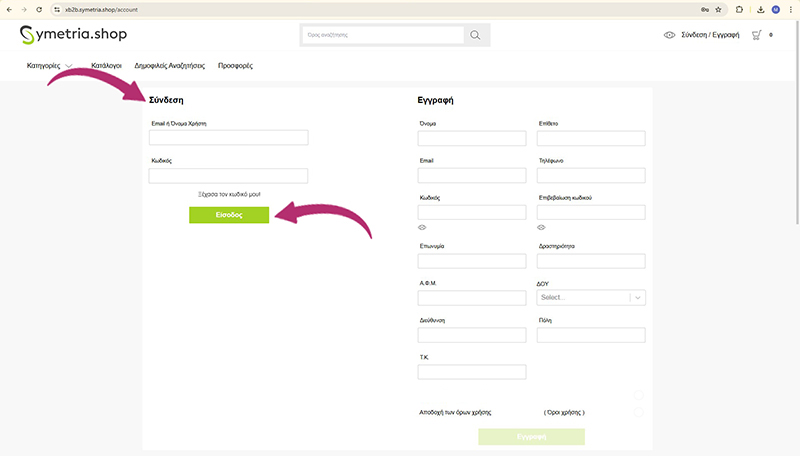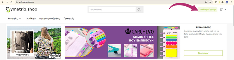 Στην Αρχική Σελίδα του νέου μας B2B πατήστε Σύνδεση/Εγγραφή πάνω δεξιά.