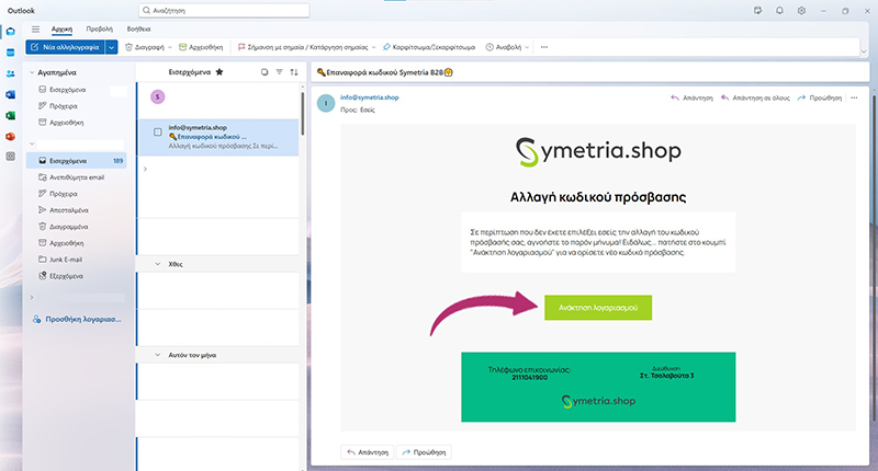 Ανοίγετε το email σας και στα εισερχόμενα θα είναι ένα mail απο το info@symetria.shop για αλλαγή κωδικού πρόσβασης. Πατήστε Ανάκτηση Λογαριασμού.